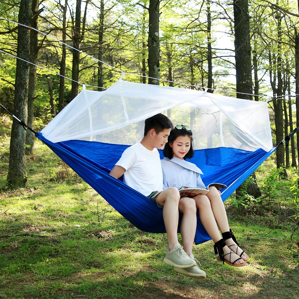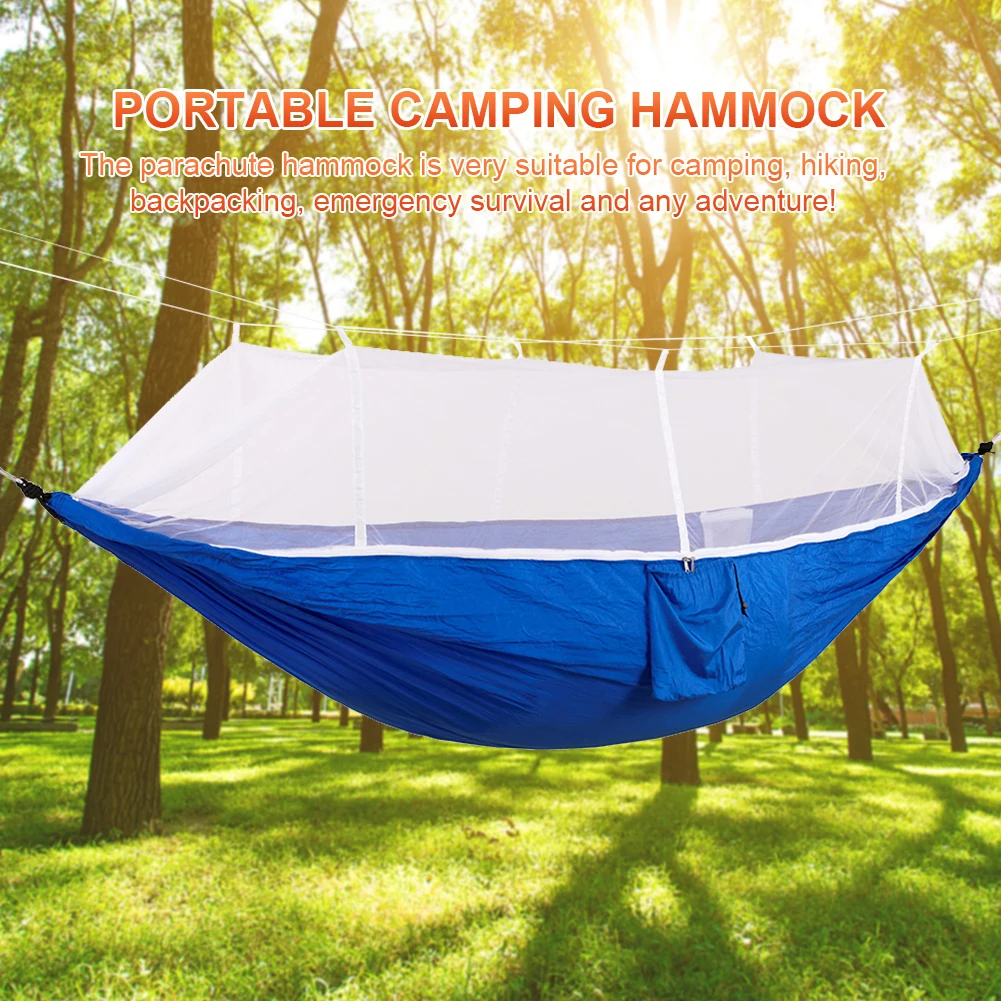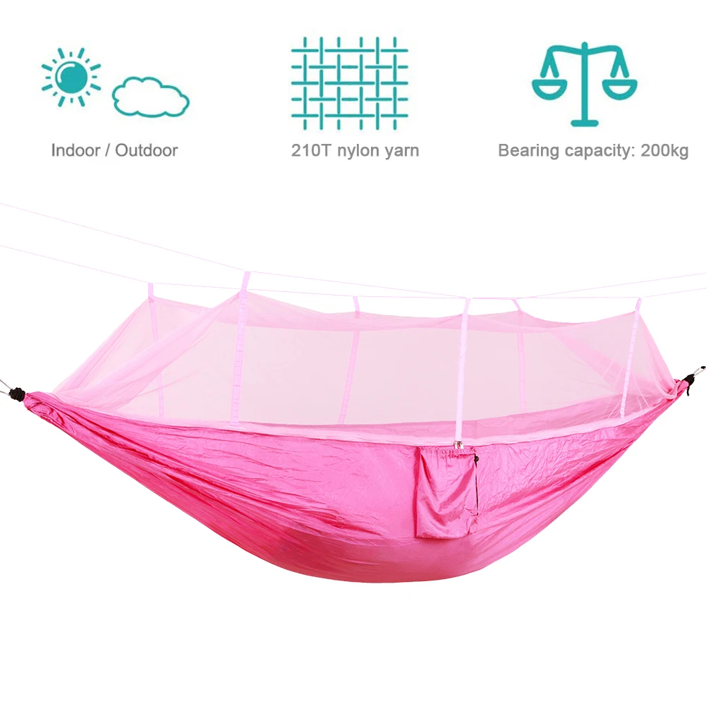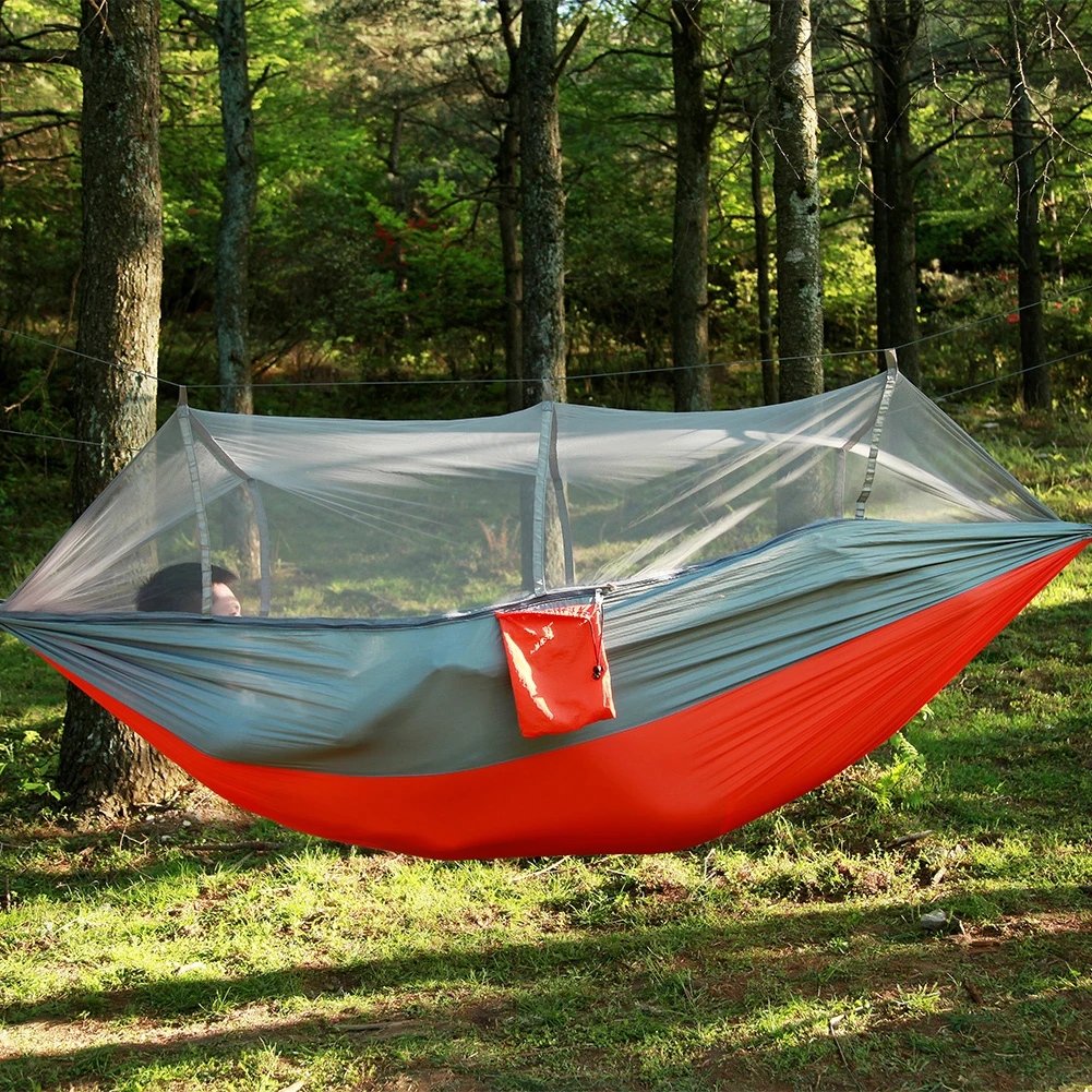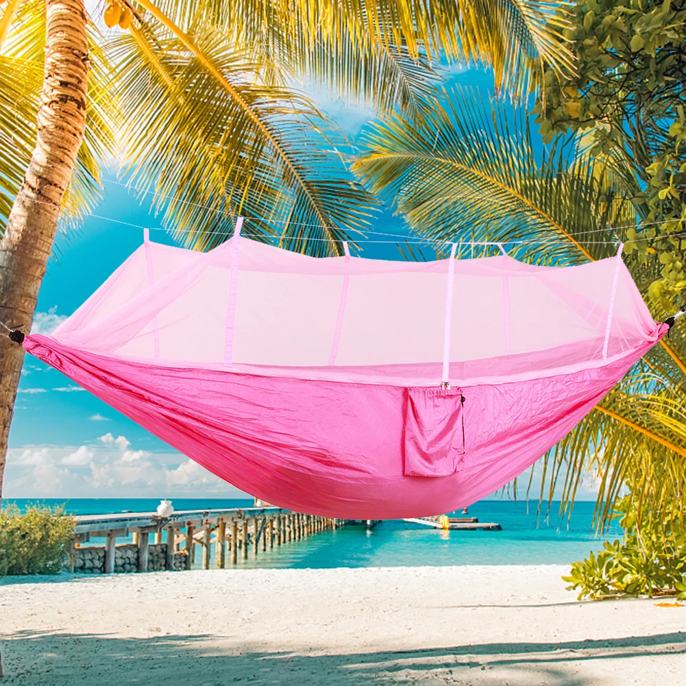 Lightweight Hammock with Mosquito Net Breathable 1-2 Person Hammock Canopy Quick-Drying for Indoor Outdoor Travel Backyard Beach Features: 1. Durable: This Hammock Made of high quality 210T parachute nylon material which is tear resistant, breathable and quick drying. Three layers of stitching and super strong nylon straps provide reliable support and reduce pressure points. 2. Upgraded Hammock: The hammock net is made of specially designed durable net with 2 times the density of similar products on the market. When you don't need the net, please take off the rope and turn the hammock over. The storage bag can be used to store small items. 3. Lightweight and Easy to install: This hammock is perfect for camping, hiking, backpacking, emergency survival and any adventure! It only takes a few minutes to install, in a handy little integrated bag that anyone can use. 4. Sturdy: The unfolded size of our camping hammock is : 260*140cm, it can support maximum weight up to 200kg. 5.Satisfaction Guarantee: We strive to provide each customer with the highest standard of customer service to ensure you have a pleasant shopping experience. If you have any issues, inquiries or need assistance, please feel free to contact us directly. Specification: Size: Two-person Type: HAMMOCK Note: